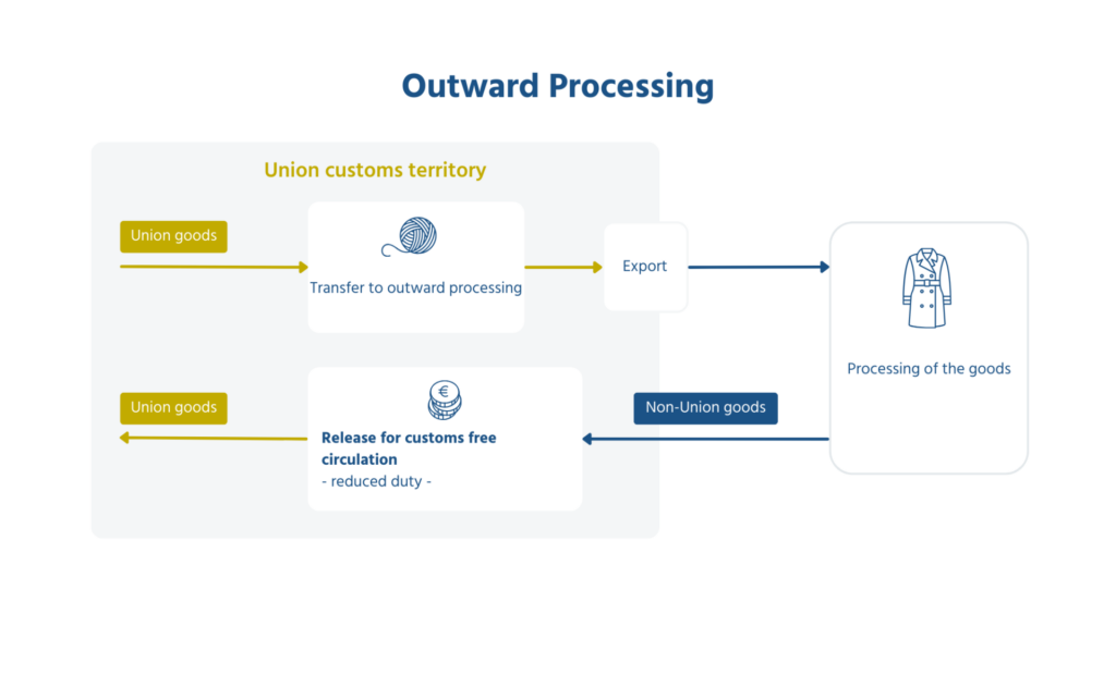The outward processing procedure means that a country’s goods (Union goods) may be temporarily exported from the customs territory of the Union in order to carry out processing operations. Processing operations include the working, processing, destruction or repair of goods.