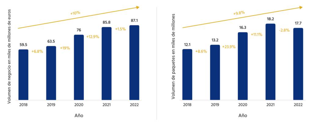 Mercado europeo de paquetería: evolución de los ingresos (gráfico 1) y de los volúmenes de paquetería (gráfico 2) 2018 – 2022