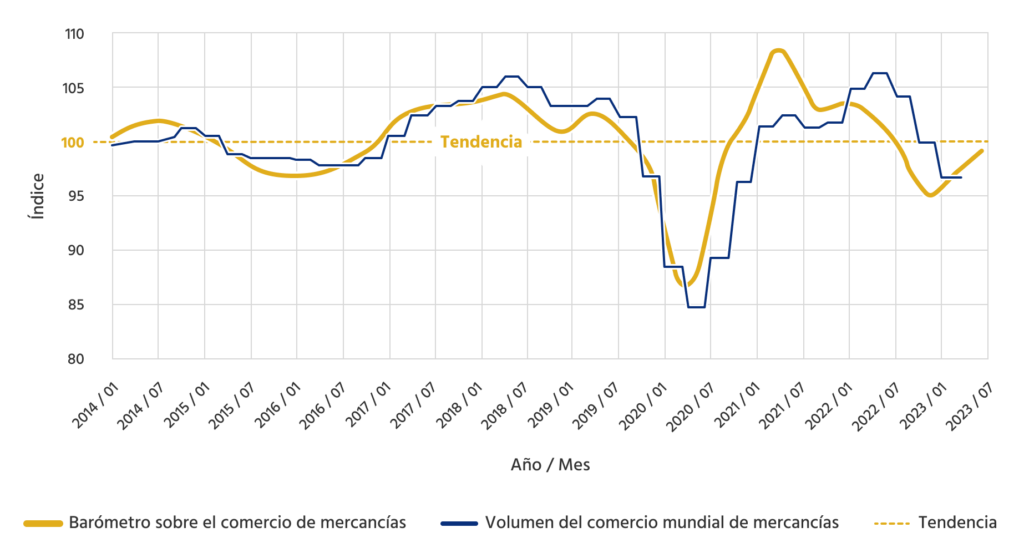 El Barómetro sobre el Comercio de Mercancías de la OMC , un indicador clave del comercio mundial, muestra un ligero repunte del comercio en 2023 tras el estancamiento de 2022 y de principios de este año. Aunque el volumen del comercio de mercancías disminuyó un 1,0% en el primer trimestre de 2023 en comparación con el año anterior y un 0,3% en comparación con el trimestre anterior, continuando la desaceleración iniciada en el cuarto trimestre de 2022, el índice de componentes muestra un ligero repunte, impulsado en particular por la fuerte producción de automóviles y el aumento de las exportaciones.1