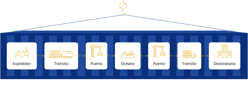 Los envíos marítimos, incluyendo la tramitación, por ejemplo, en el caso de una importación, duran una media de 18 a 20 días, pero también puede llegar a durar hasta 60 días. El plazo para los envíos por transporte marítimo en contenedores es mucho más largo que con otros medios de transporte. Cuando la carga llega al puerto de destino, se tarda algún tiempo, normalmente unos días, en descargar la carga del barco y del puerto y en transportarla al interior. En la siguiente ilustración mostramos una cadena de suministro marítima:
