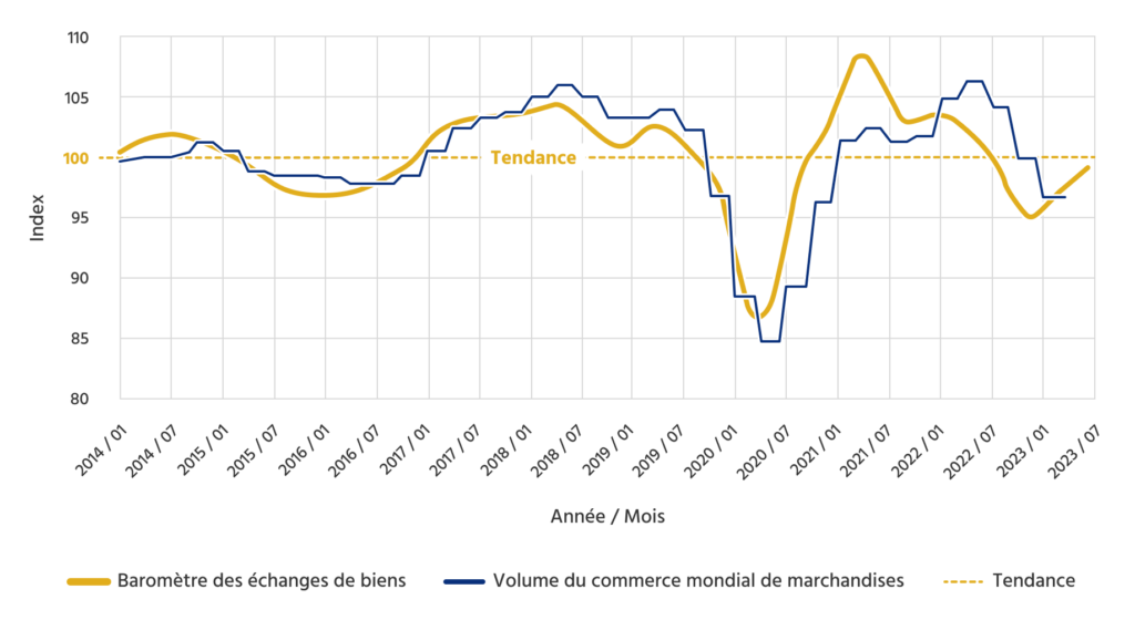 Le Baromètre du commerce des marchandises de l’OMC , indicateur avancé du commerce mondial, montre une légère reprise des échanges en 2023 après une stagnation en 2022 et au début de cette année. Bien que le volume des échanges de marchandises ait diminué de 1,0 % au premier trimestre 2023 par rapport à l’année précédente et de 0,3 % par rapport au trimestre précédent, poursuivant le repli amorcé au quatrième trimestre 2022, l’indice des composantes montre une légère reprise, tirée notamment par une forte production automobile et des exportations en hausse.1