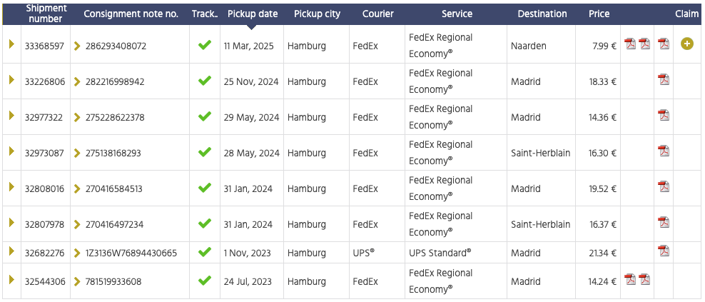 After successful booking, you will find the tracking number or consignment note number for your shipment in the archive under ‘Archive & Tracking’. Please note that tracking numbers may look different depending on the carrier and vary in length (numbers only or a combination of numbers and letters).